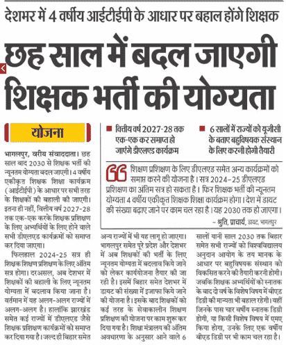 - ताजा जानकारी के मुताबिक हम आपको बताना चाहते हैं कि 6 साल बाद यानी 2030 से शिक्षक भर्ती की न्यूनतम योग्यता में बदलाव किया जाएगा, जिसके बाद 4 साल का इंटीग्रेटेड टीचर एजुकेशन प्रोग्राम/टीचर एजुकेशन प्रोग्राम पेश किया जाएगा।