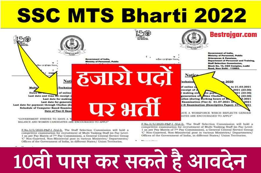 SSC MTS Bharti 2022: सरकारी नौकरी की तलाश में लगे अभ्यर्थियों के लिए यह बहुत अच्छी खबर है। उन सभी उम्मीदवारों के लिए केंद्र सरकार द्वारा सरकारी नौकरियों को हटा दिया गया है। भारत सरकार के विभाग द्वारा सरकारी नौकरी के लिए इच्छुक उम्मीदवारों के लिए यह एक महत्वपूर्ण जानकारी है। हम जानते हैं कि भारत सरकार के मंत्रालय हैं और उनके तहत, उम्मीदवार को विभिन्न विभागों और संगठनों में 10 वीं पास के लिए सरकारी नौकरी पाने के लिए एक बहुत अच्छा अवसर दिया जा रहा है। यह भर्ती कुल 3603 पदों के लिए शुरू की गई थी।